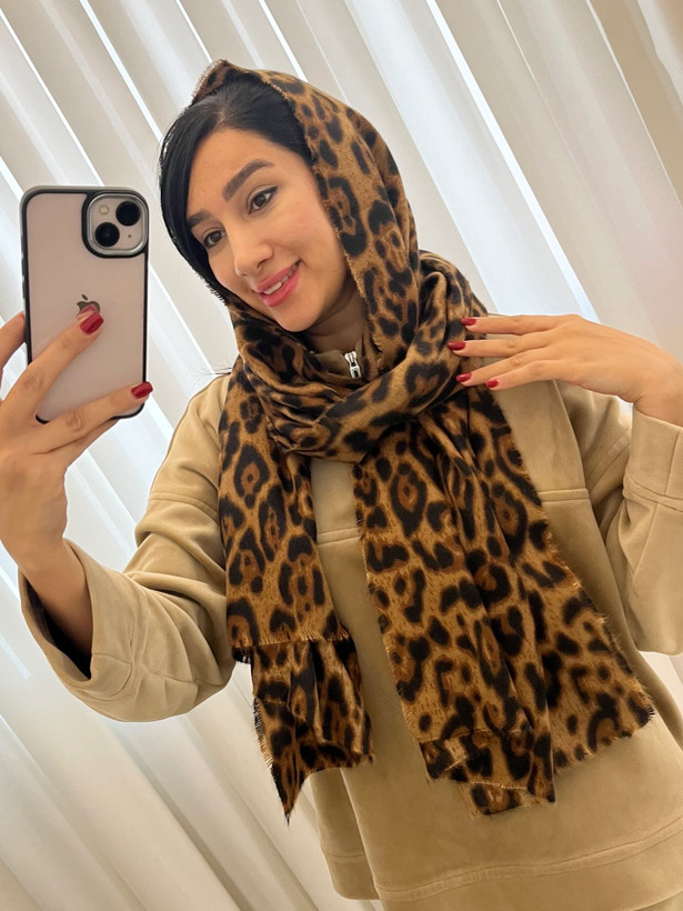 این شال پلنگی جنس بسیار لطیف و ظریفی داره ،بسیار خوش سره ،دورریشه و پشت و روش تفاوت نداره ،ینی پشتش سفید نیست،وارداتیه