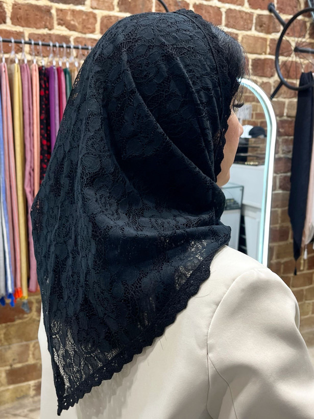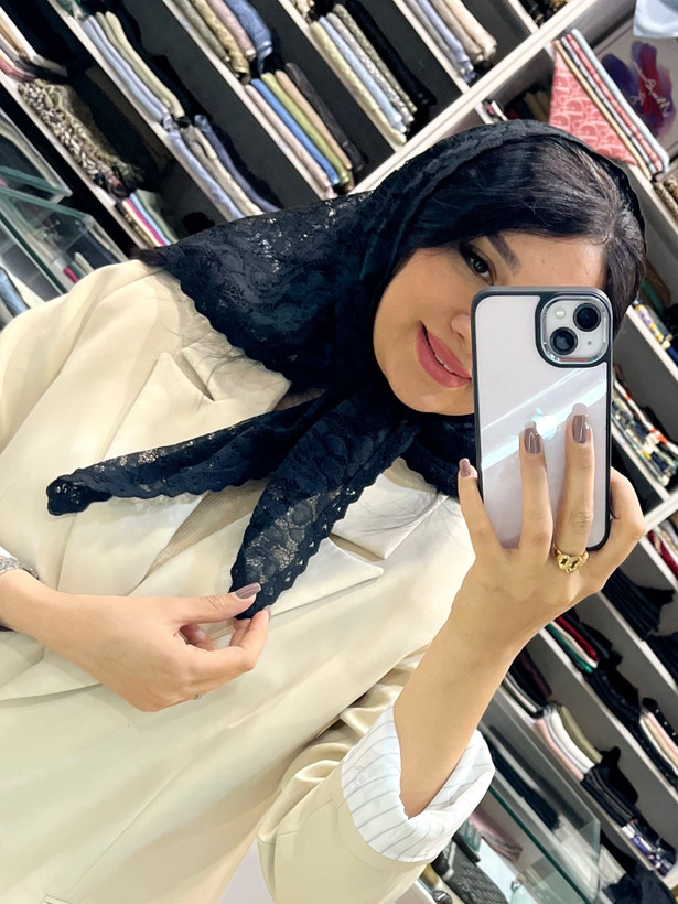 روسری گیپور مشکی با ابعاد مناسب که راحت گره میخوره و حاشیه دانتل ظریف و زیبا